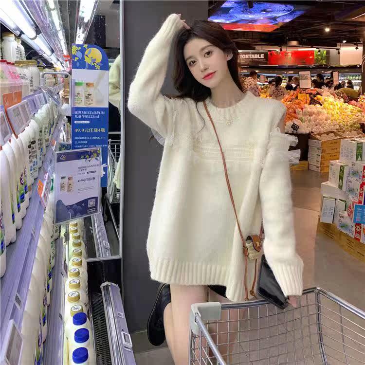 2021冬韩版小心机露肩毛衣女宽松慵懒圆领网纱拼接设计感外搭上衣热门设计联盟服务商